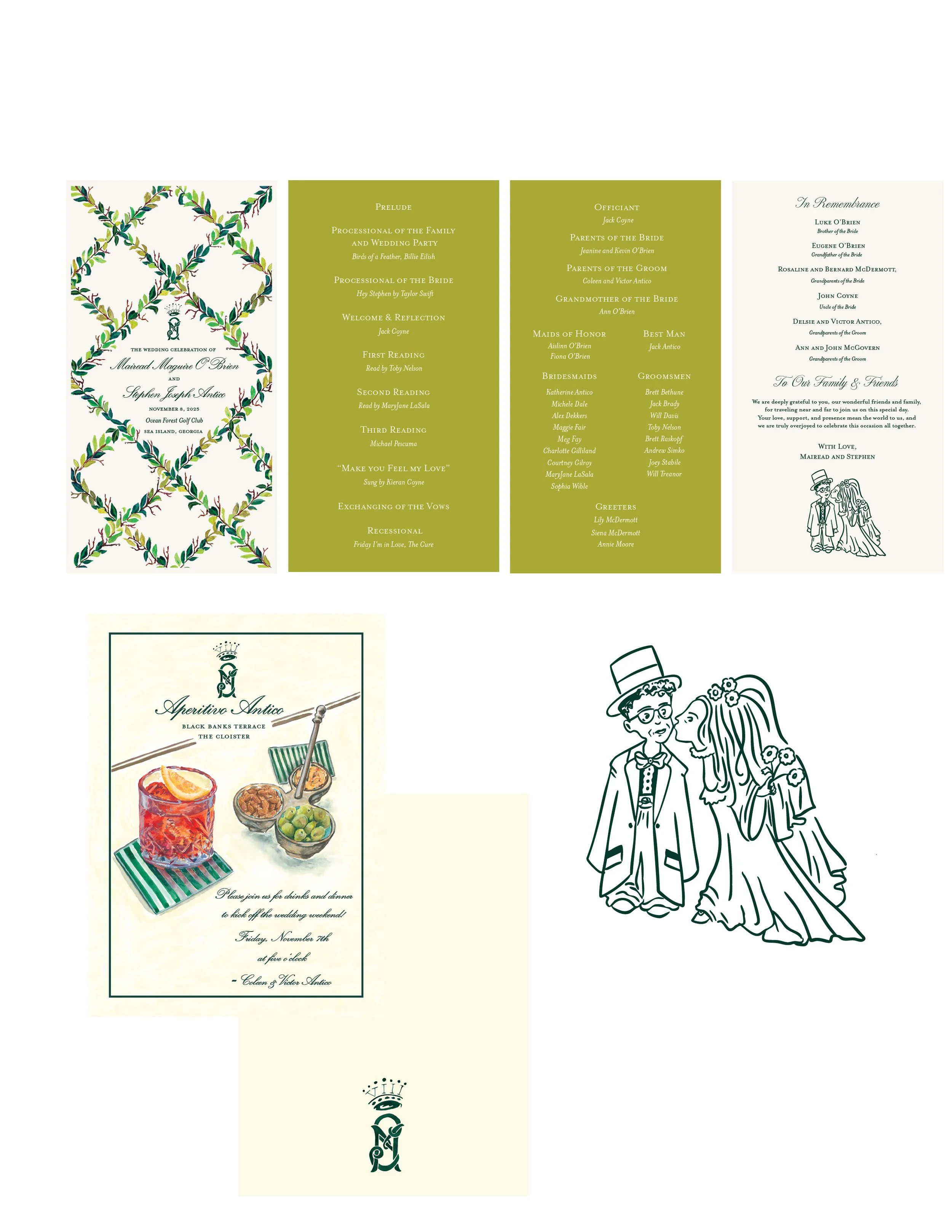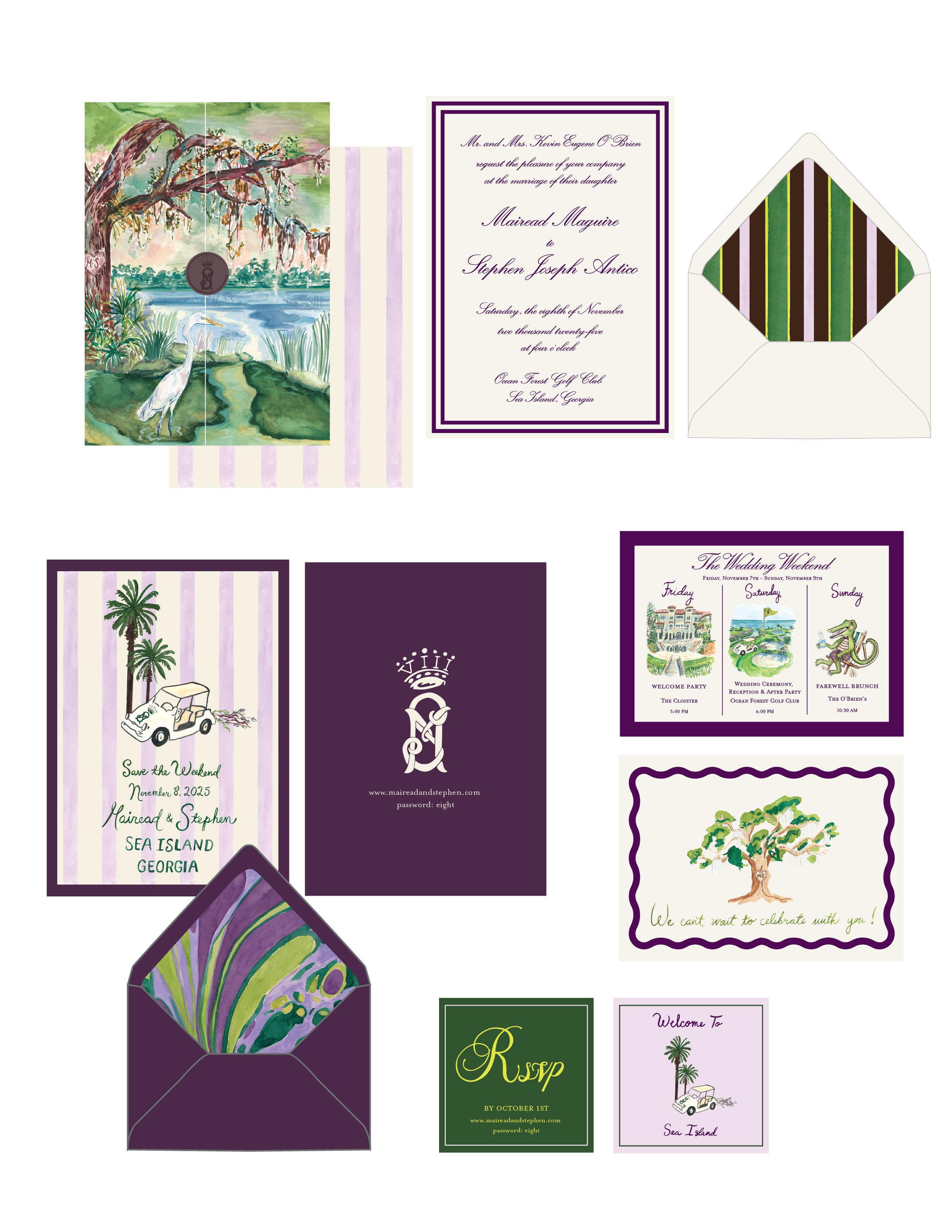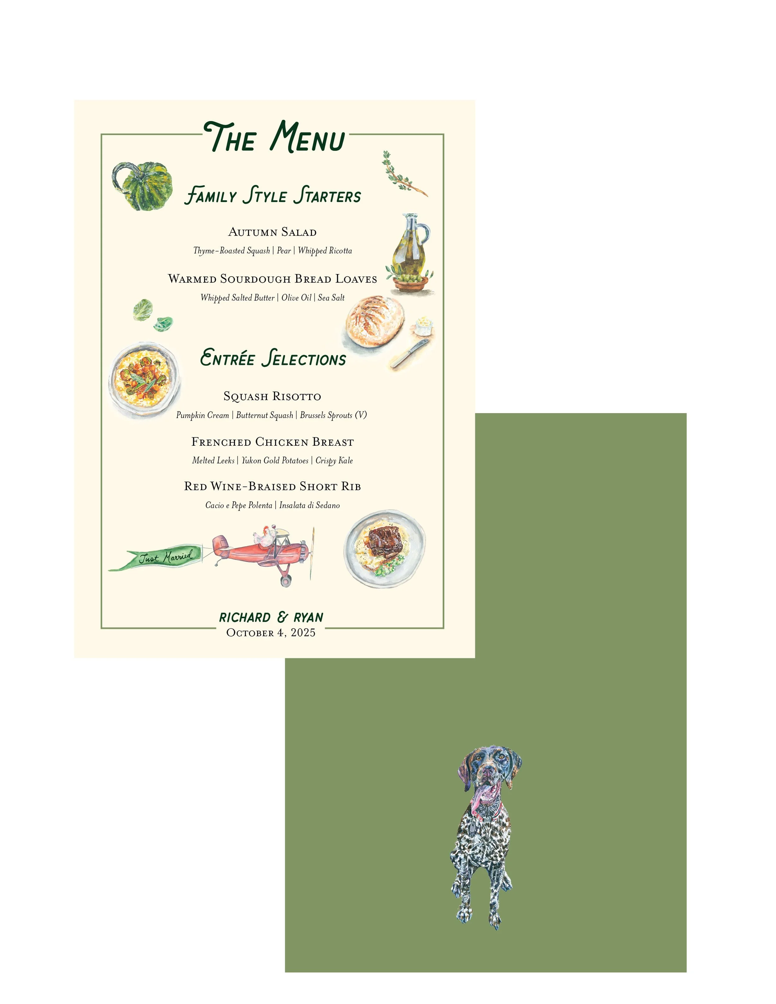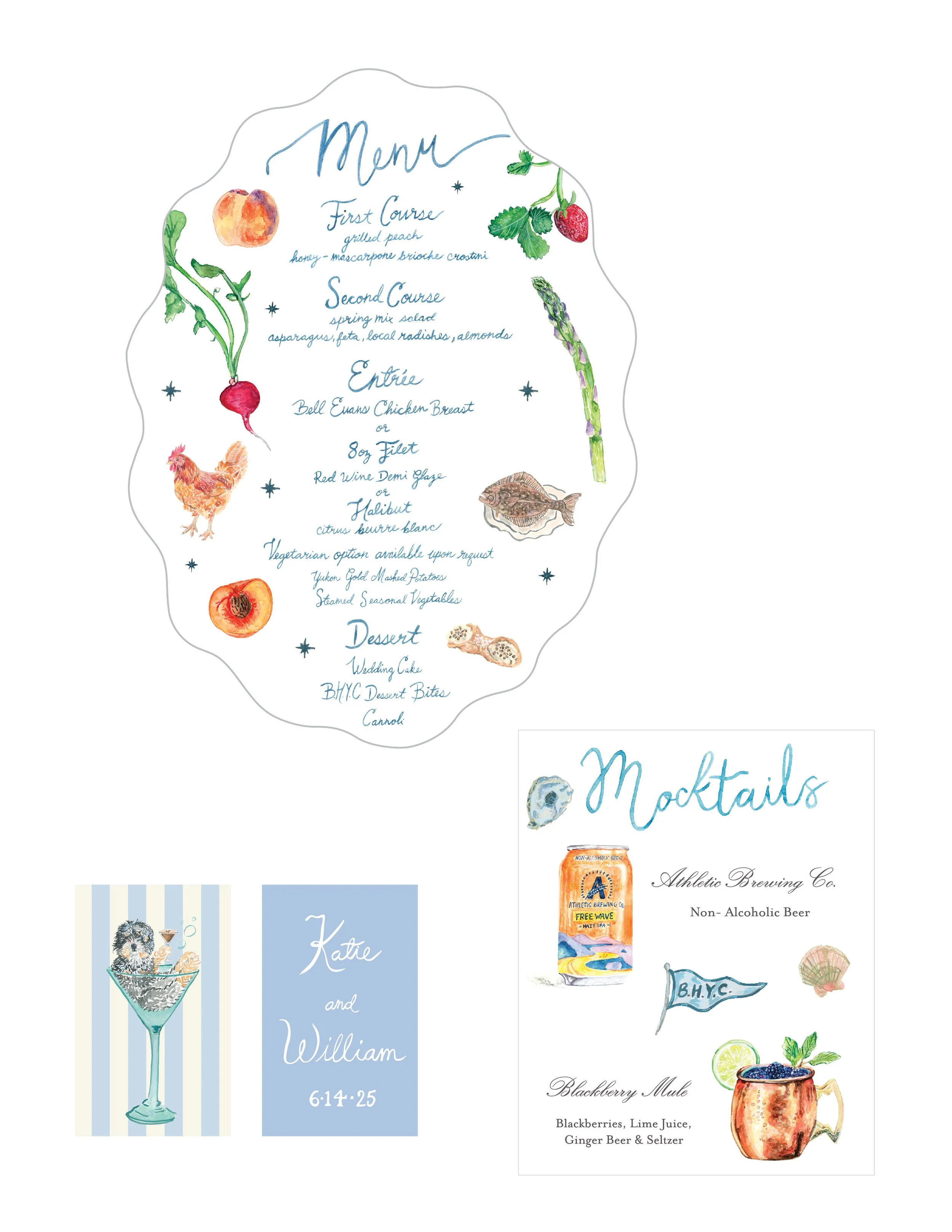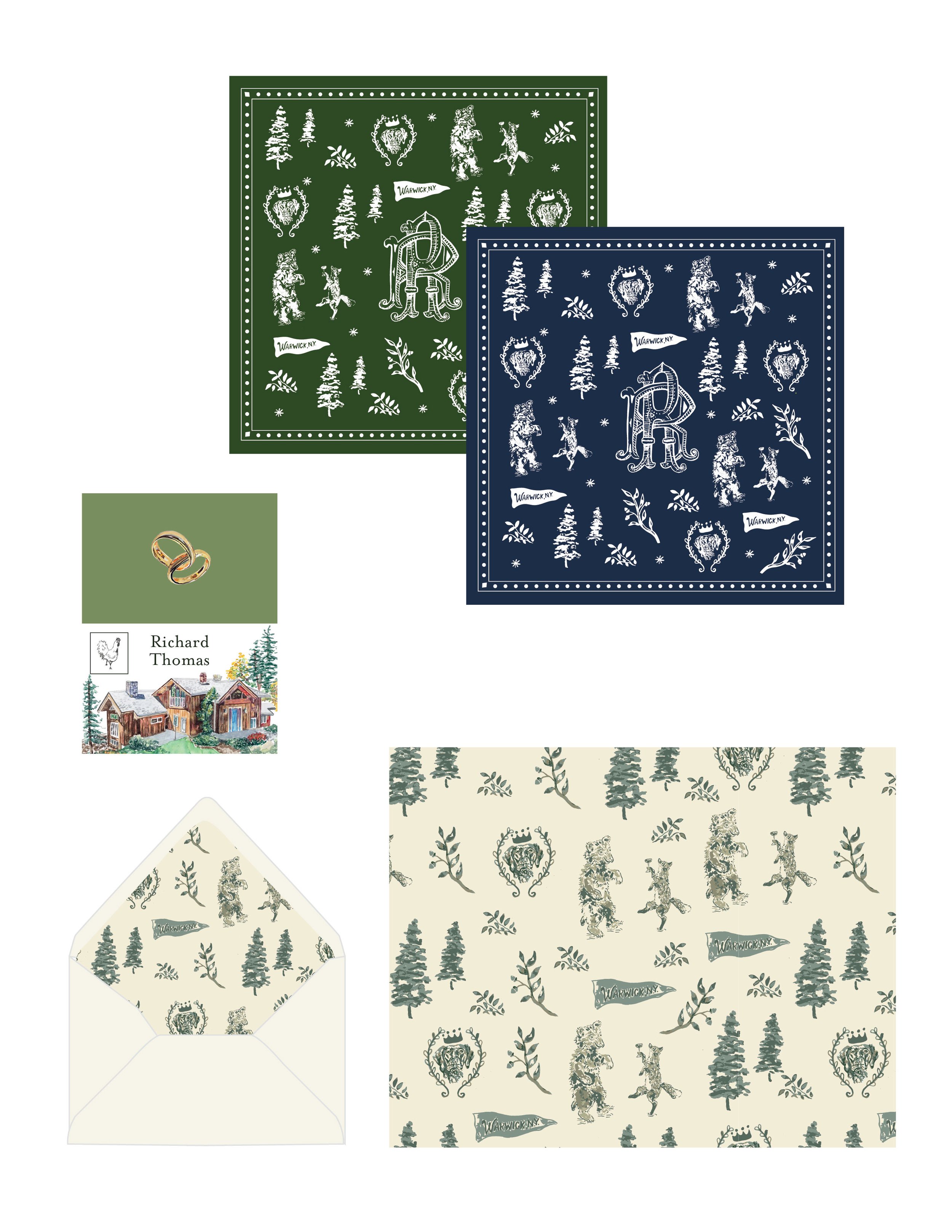 Designed a wedding suite for Richard and Ryan who were getting married in Warwick, New York. an upscale wedding with a woodsey flari, featureing fabulous floral for their very own garden & a focus on a particurlay special pup named gretchen. I designed the weddig crest, save-the-date, envelope liner, and a four-page accordion-fold invitation. The Day-of items included cocktail menu, table menu, ceremony programs, bandanas, escort cards, field guide (a guide to local provisions), a seating chart, and custom table flags.